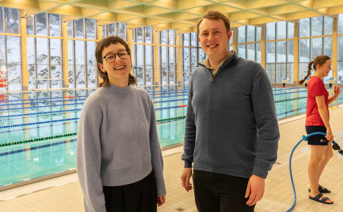 Imponert over resultatet: Venil Sælebakke og Fredrik Noralv Veggeland, rådgivere for klima og grønn finans i Kommunalbanken er imponerte over både klimatiltakene som ble utført under byggingen av Tøyenbadet og det endelige resultatet.