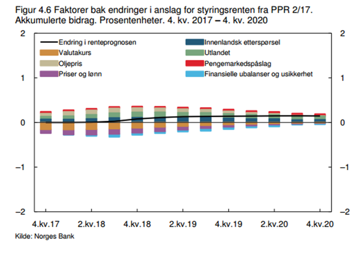Sentralbanken uttrykker ingen bekymring for den noe sterkere kronekursen, de argumenterer for at dette skyldes fundamentale faktorer som oljeprisen. De forventer uendret kronekurs (importvektet I-44 indeks) ut året. De forventer en 1,5 prosent kronestyrkelse gjennom 2018, og en moderat 3 prosent kronestyrkelse ved utgangen av prognoseperioden i 2020. De vil kanskje derfor være forsiktig med å være først ute med rentehevingene, og vil nok antas å skjele til nabo-sentralbankene (Riksbanken, ECB) for å unngå en markant kronestyrkelse, som igjen vil trekke ned inflasjonen.