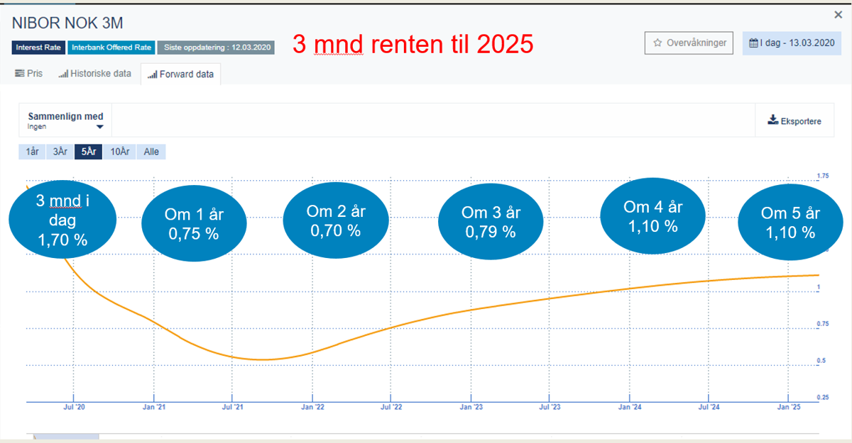 De samlede tiltak fra Norges Bank, Finanstilsynet og regjeringen vil mest sannsynlig roe markedene, og sikre at det er nok likviditet i banksystemet til å sikre at rentene til bedriftskundene ikke stiger vesentlig fra dagens nivå. Norges Bank anslår i forbindelse med rentemøte i dag at boliglånsrenten kan falle fra dagens nivå på rundt 3 prosent til nær 2 prosent om ett til to års tid. Hvor raskt og stort rentekutt boliglånskunder og andre lånekunder vil få bli en vurdering fra hver enkelt bank. Det viktigste er at summen av grepene fra Norges Bank skal hindre at rentene i interbankmarkedet stiger, og at bankene nå får rom til å hjelpe sine bedriftskunder. Oslo Børs stiger etter at Sentralbanken i USA gjorde kraftfulle tiltak i går, og etter at Norges Bank viste handlekraft i dag.
