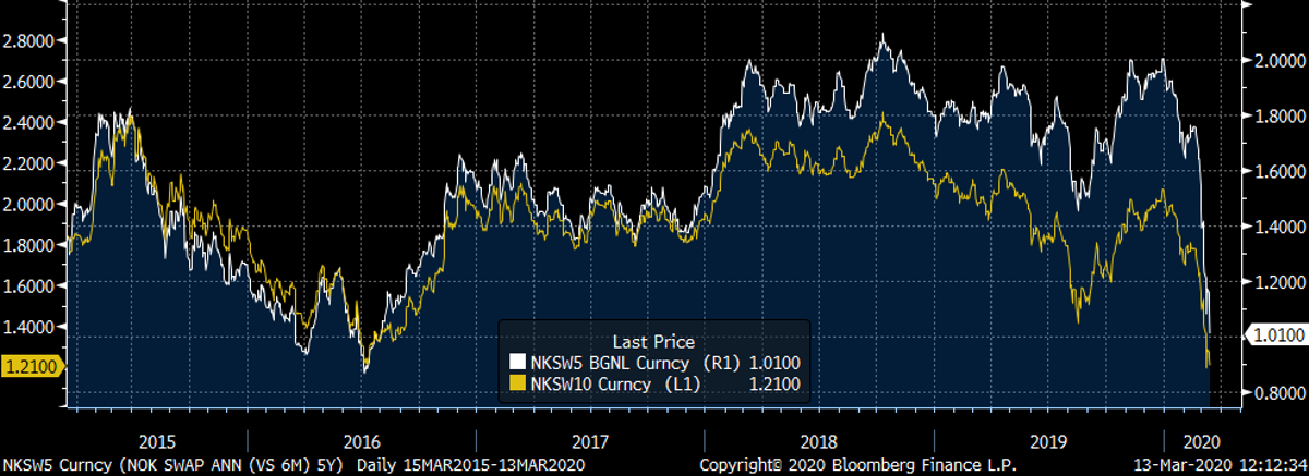 Nibor 3 mnd ble i dag satt til 1,7 prosent og dermed et påslag på 70 basispunkter over styringsrenten. Dette er svært høyt, og vi ser likhetstrekk mot differansene som oppsto under finanskrisen i 2008. Vi antar at differansen nå skyldes generell usikkerhet i markedet. Pengemarkedsrentene bør falle i og med at Norges Bank har tilført ekstraordinære F-lån.