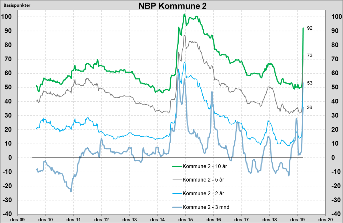 Figuren viser indikative kredittpåslag over NIBOR/SWAP på ulike løpetider i kapitalmarkedet for en gjennomsnittlig kommune i dette markedet.