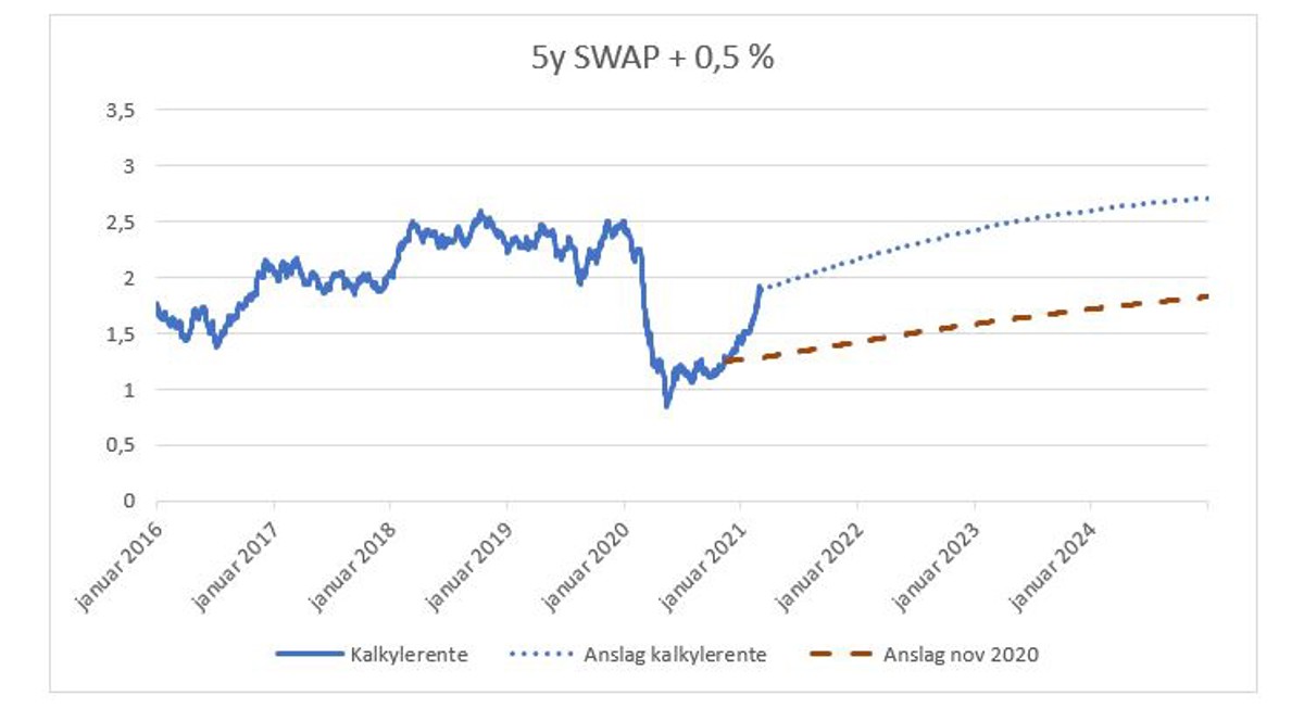 Starten av året har gitt tydelig oppgang i lange renter, og oppgangen har vært kraftigere enn prognosene fra slutten av 2020. Dermed kan det være grunn til å se på kalkylerenten på nytt.