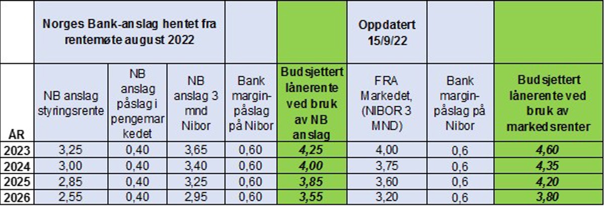 Sentralbanksjefen i Norge fortalte under en tale i Arendalsuka at normal styringsrente er 2 prosent, og at det i dag er behov for klart høyere rente. Sentralbankrenten i dag er 1,75 prosent. Som det fremgår i tabellen nedenfor, forventer markedet at FRA prisene topper ut med snittrente på 4 prosent i 2023, det vil gi en styringsrente fra Norges Bank i området 3,5-3,75 prosent. Det betyr da at budsjettert lånerente vil nå sitt høyeste nivå iløpet av 2023, og ligge i overkant av 4,5 prosent.